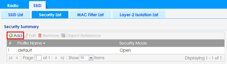 1 Go to Configuration > Object > AP Profile > SSID > Security List. Click Add to create a new security profile on the Zyxel Device.