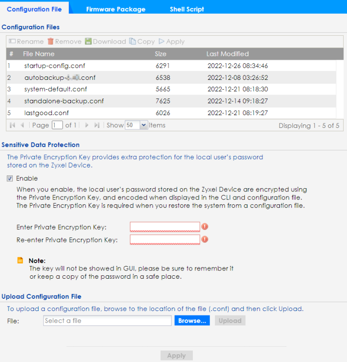 File Name | This column displays the label that identifies a configuration file. You cannot delete the following configuration files or change their file names. The system-default.conf file contains the Zyxel Device’s default settings. Select this file and click Apply to reset all of the Zyxel Device settings to the factory defaults. This configuration file is included when you upload a firmware package. The startup-config.conf file is the configuration file that the Zyxel Device is currently using. If you make and save changes during your management session, the changes are applied to this configuration file. The Zyxel Device applies configuration changes made in the Web Configurator to the configuration file when you click Apply or OK. It applies configuration changes made through CLI commands when you use the write command. The lastgood.conf is the most recently used (valid) configuration file that was saved when the Zyxel Device last restarted. If you upload and apply a configuration file with an error, you can apply lastgood.conf to return to a valid configuration. |